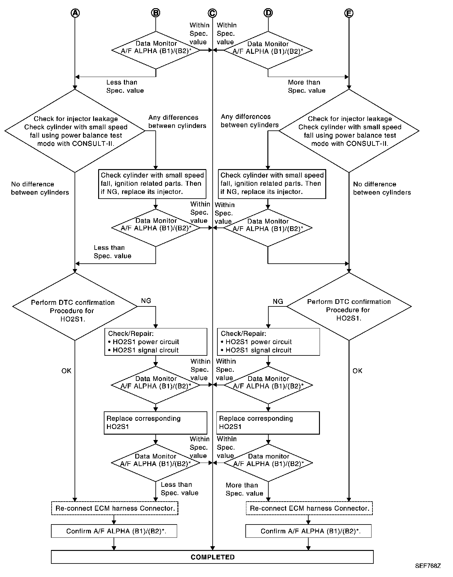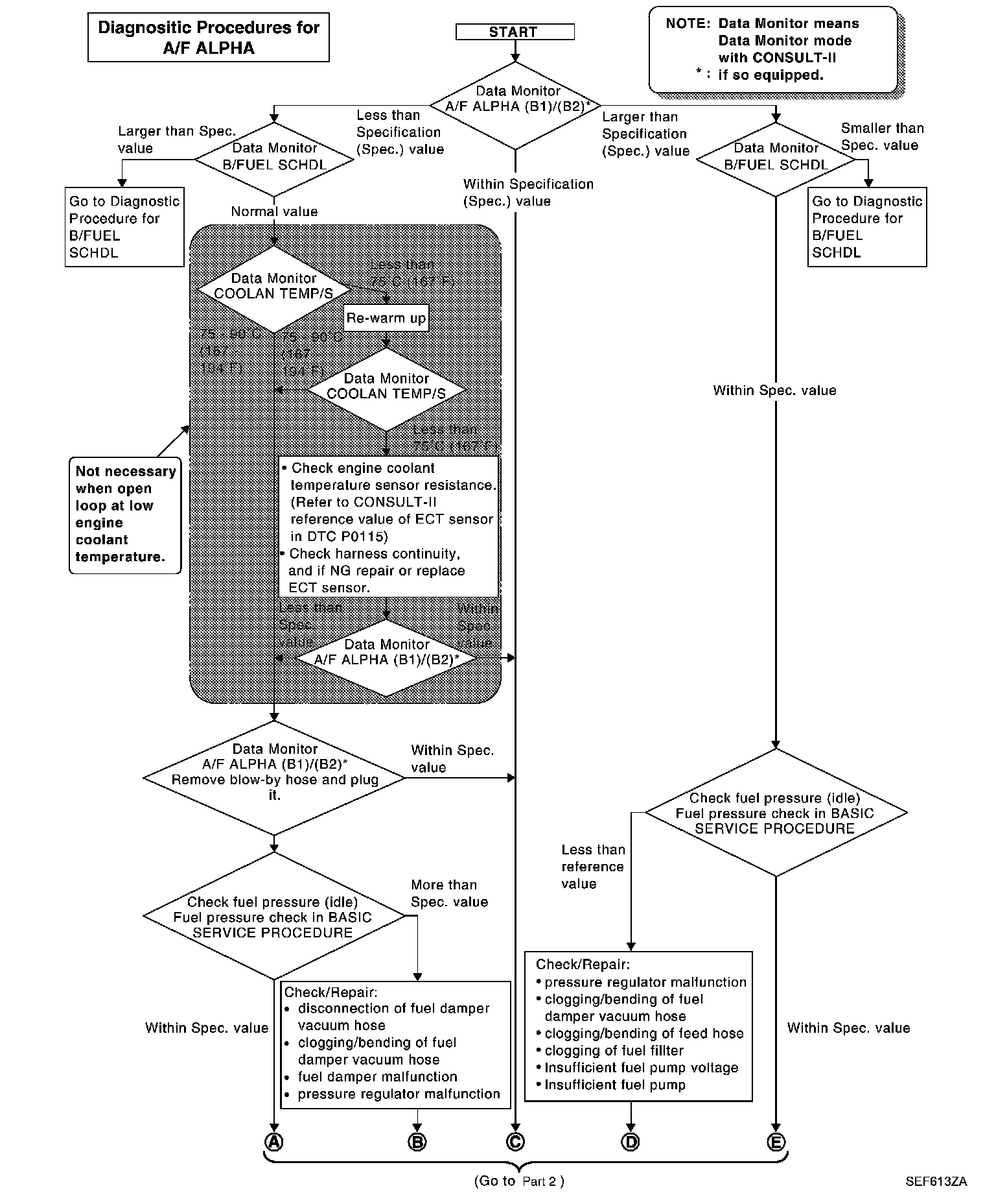 DescriptionThe specification (SP) value indicates the tolerance of the value that is displayed in "DATA MONITOR (SPEC)" mode of CONSULT-II during normal operation of the Engine Control System. When the value in "DATA MONITOR (SPEC)" mode is within the SP value, the Engine Control System is confirmed OK. When the value in "DATA MONITOR (SPEC)" mode is NOT within the SP value, the Engine Control System may have one or more malfunctions.