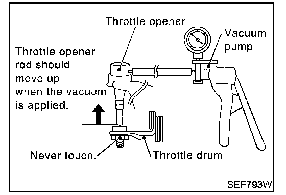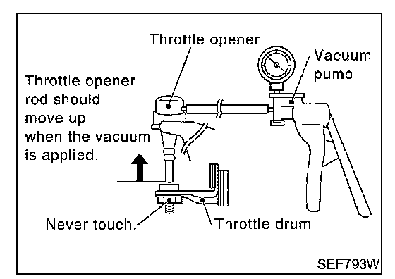 5. Apply vacuum [more than -40.0 kPa (-300 mmHg, 11.81 inHg)] until the throttle drum becomes free from the rod of the throttle opener.