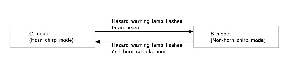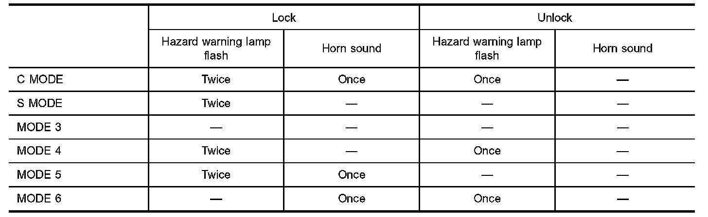 When LOCK and UNLOCK signals are sent from the keyfob for more than 2 seconds at the same time, the hazard and horn reminder mode is changed and hazard warning lamp flashes and horn sounds as shown above: