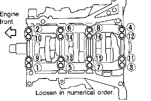 9. Loosen bolts in numerical order as shown and remove main bearing beam, bearing cap and crankshaft.