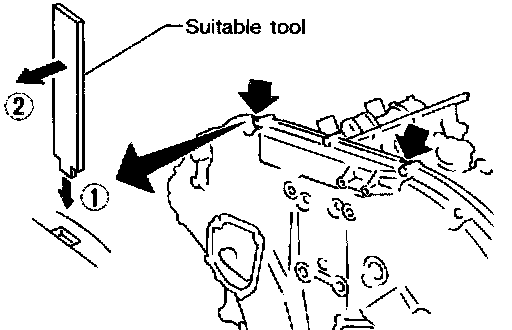 b. Disconnect liquid gasket applied portion using seal cutter (special service tool: KV101 11100) or an equivalent tool. Then remove rear timing chain case.