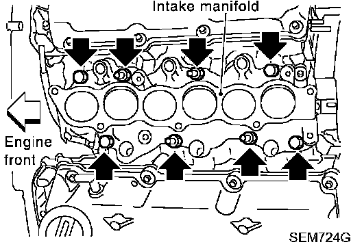 10. Remove intake manifold loosening bolts and nuts in reverse order of tightening.