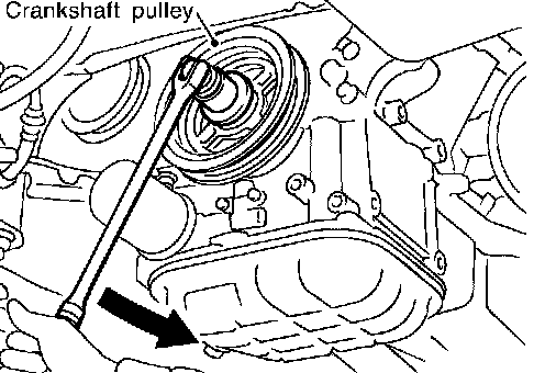 19. Loosen crankshaft pulley bolt. (At this time remove oil pan rear cover plate and set a suitable tool to ring gear so that crankshaft cannot rotate.)