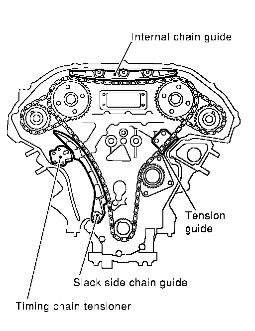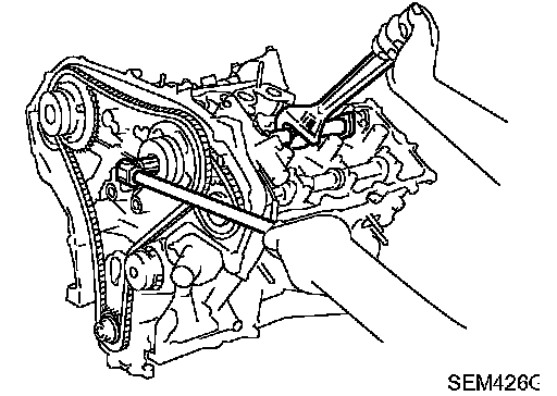 CAUTION: After removing timing chain, do not turn crankshaft and camshaft separately, or valves will strike piston heads.