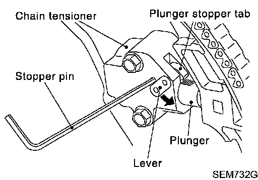 b. Insert stopper pin into tensioner body hole to fix lever, and keep the tab released.