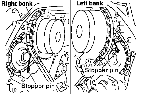 35. Attach a suitable stopper pin to RH and LH camshaft chain tensioners. (For secondary timing chains)