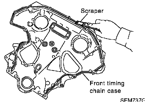 40. Use a scraper to remove all traces of liquid gasket from front and rear timing chain case, and opposite mating surfaces.