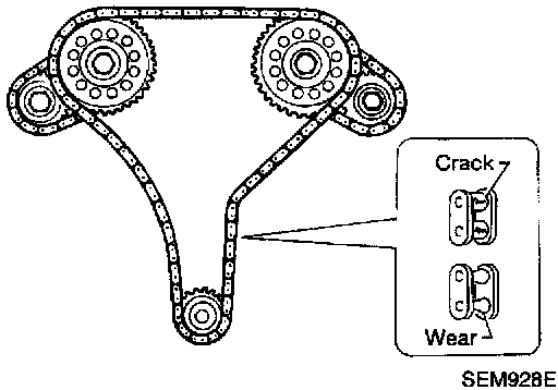 Check for cracks and excessive wear at roller links. Replace chain if necessary.