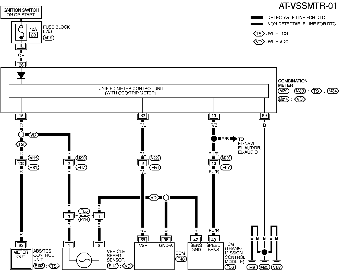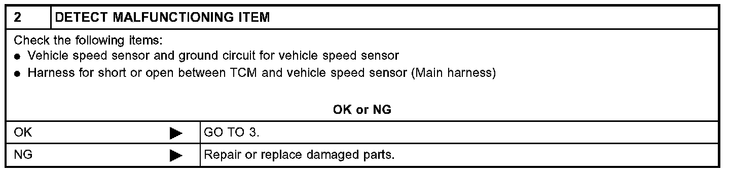 Diagnostic trouble code VHCL SPEED SEN MTR with CONSULT-II or 2nd judgement flicker without CONSULT-II is detected when TCM does not receive the proper voltage signal from the sensor.