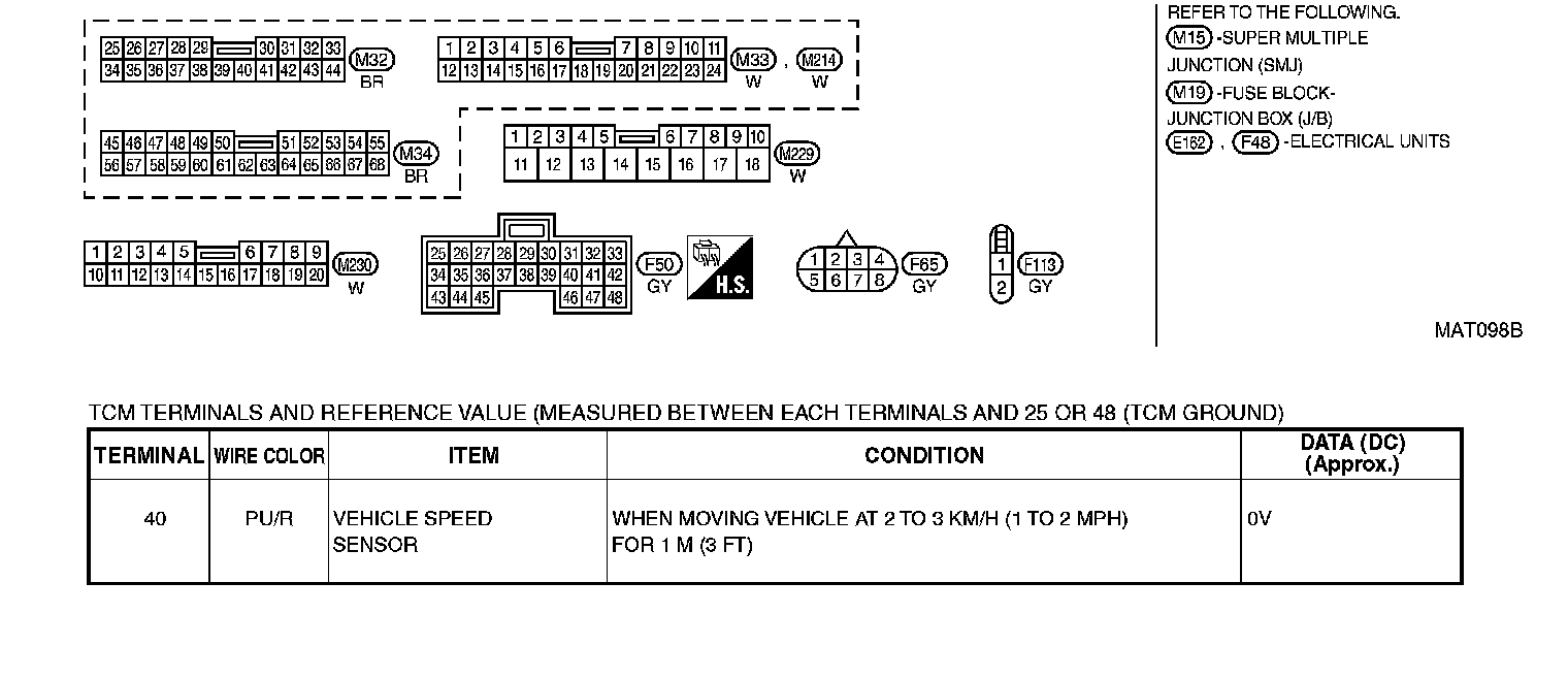 DescriptionThe vehicle speed sensor MTR is built into the speedometer assembly. The sensor functions as an auxiliary device to the revolution sensor when it is malfunctioning. The TCM will then use a signal sent from the vehicle speed sensor MTR.