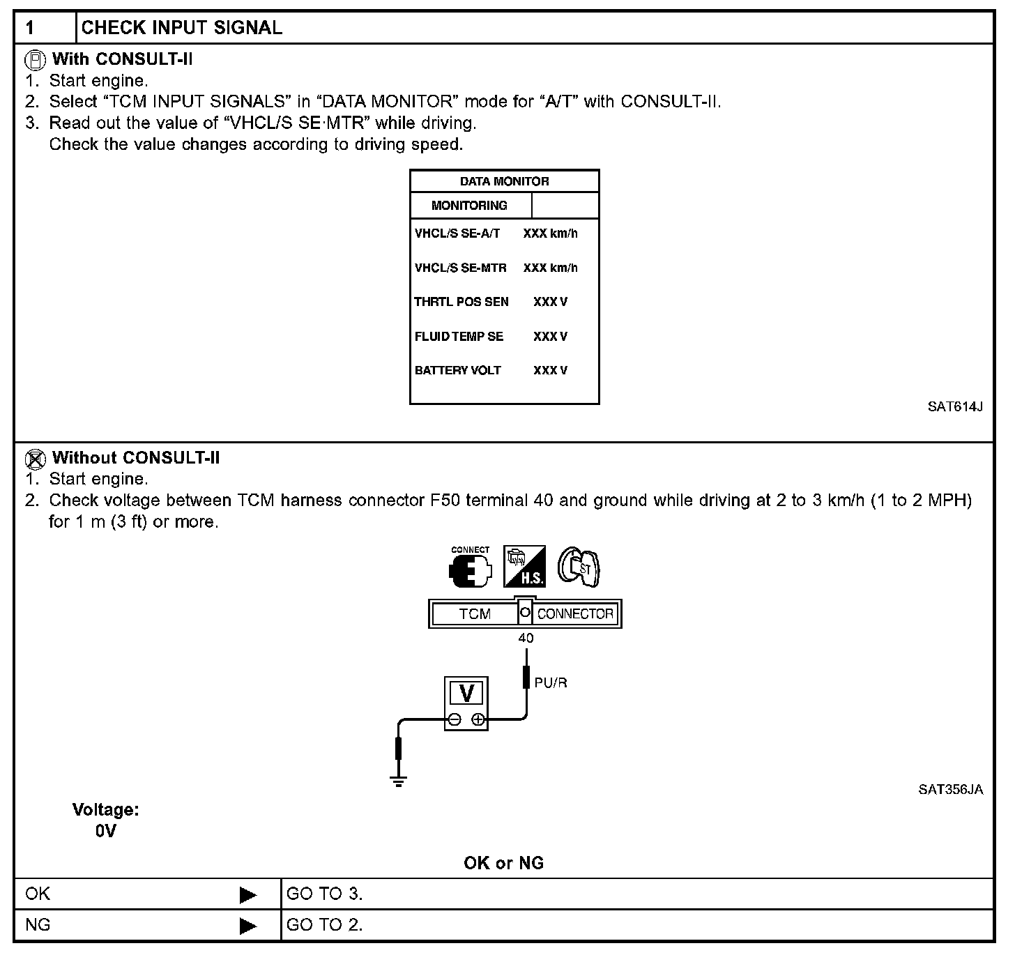 1. Turn ignition switch ON and select "DATA MONITOR" mode for "A/T" with CONSULT-II.