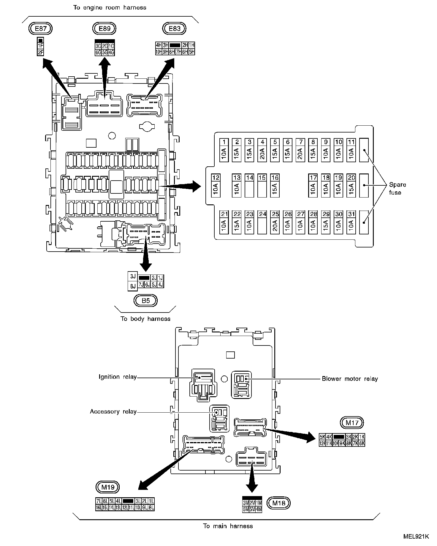 Fuse Block - Junction Box (J/B) - Terminal Arrangement: