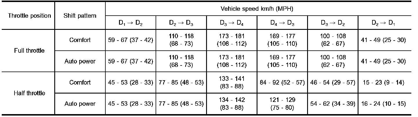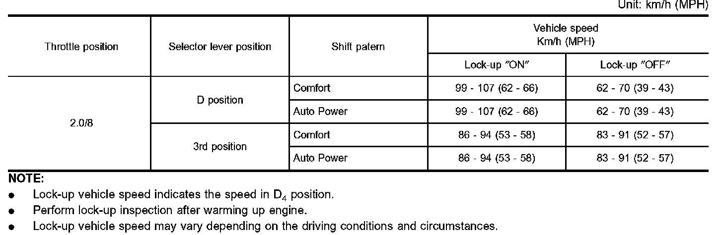 - Lock-up vehicle speed indicates the speed in D4 position.