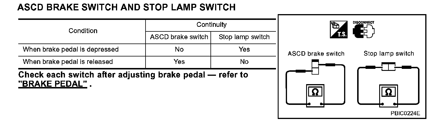 Check each switch after adjusting brake pedal - refer to "BRAKE PEDAL AND BRACKET".