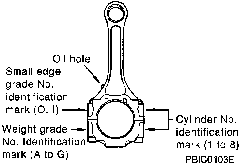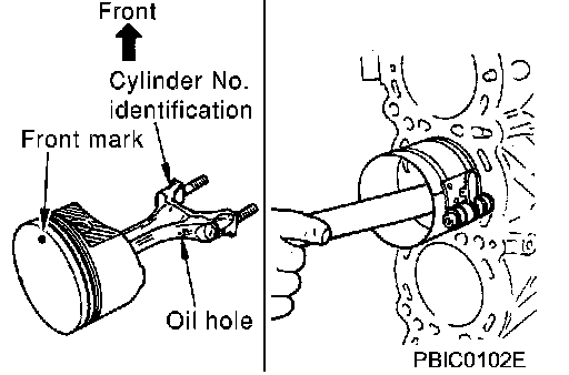 Assemble so that the front mark on the piston crown and the oil holes and the cylinder No. on the connecting rod are positioned as shown in the figure.