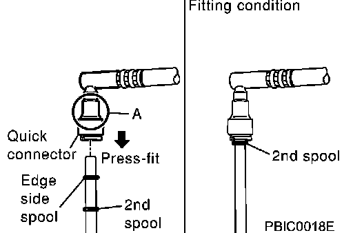 Insert fuel tube into quick connector until upper spool is completely inside quick connector, and lower spool exposes right below quick connector.