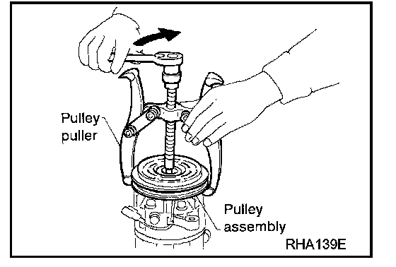 To prevent the pulley groove from being deformed, the puller claws should be positioned into the edge of the pulley assembly.