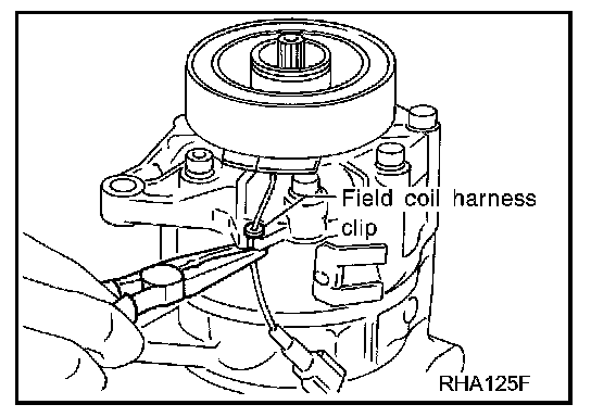 5. Remove the field coil harness clip using a pair of pliers.
