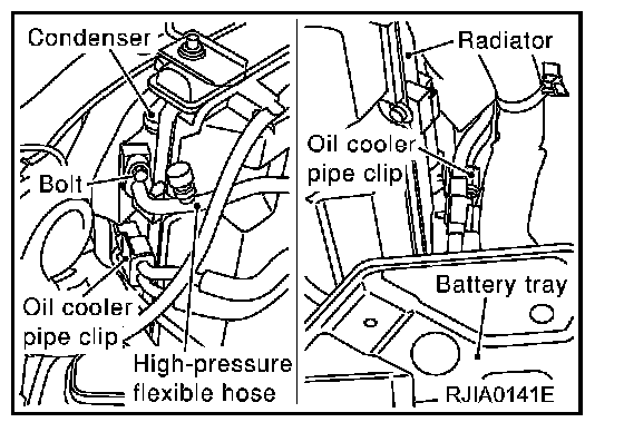 5. Remove oil cooler pipe clips from left and right sides of the condenser.