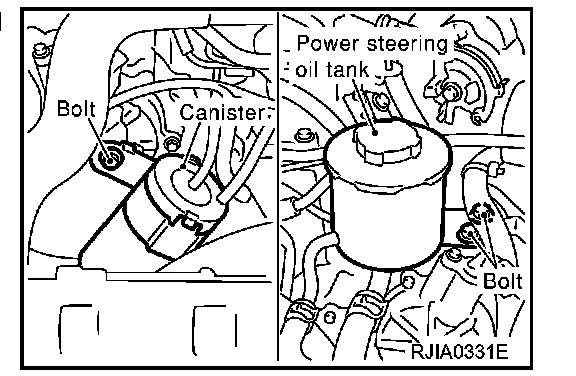 9. Remove power steering oil tank and canister.