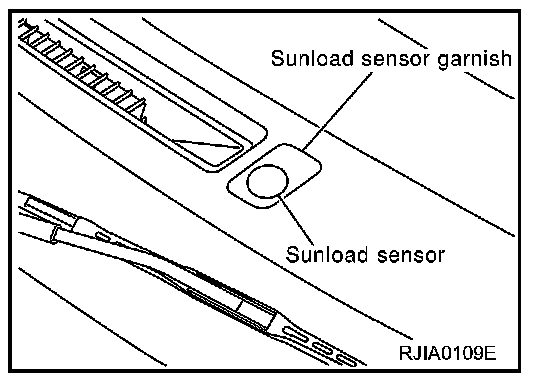 The sunload sensor is located on the left defroster grille. It detects sunload entering through windshield by means of a photo diode. The sensor converts the sunload into a current value which is then input into the auto amplifier.