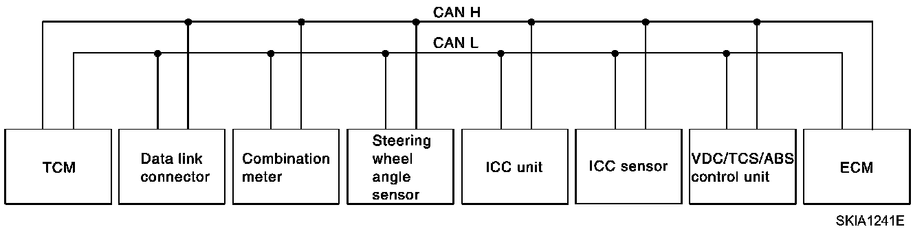 SYSTEM DESCRIPTIONCAN (Controller Area Network) is a serial communication line for real time application. It is an on-vehicle multiplex communication line with high data communication speed and excellent error detection ability. Many electronic control units are equipped onto a vehicle, and each control unit shares information and links with other control units during operation (not independent). In CAN communication, control units are connected with 2 communication lines (CAN H line, CAN L line) allowing a high rate of information transmission with less wiring. Each control unit transmits/ receives data but selectively reads required data only.