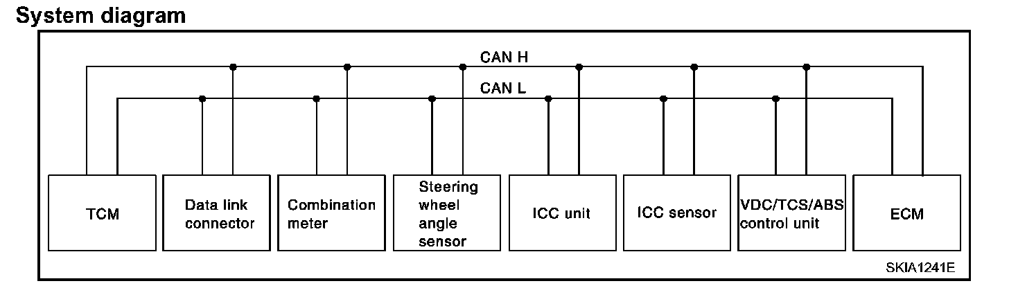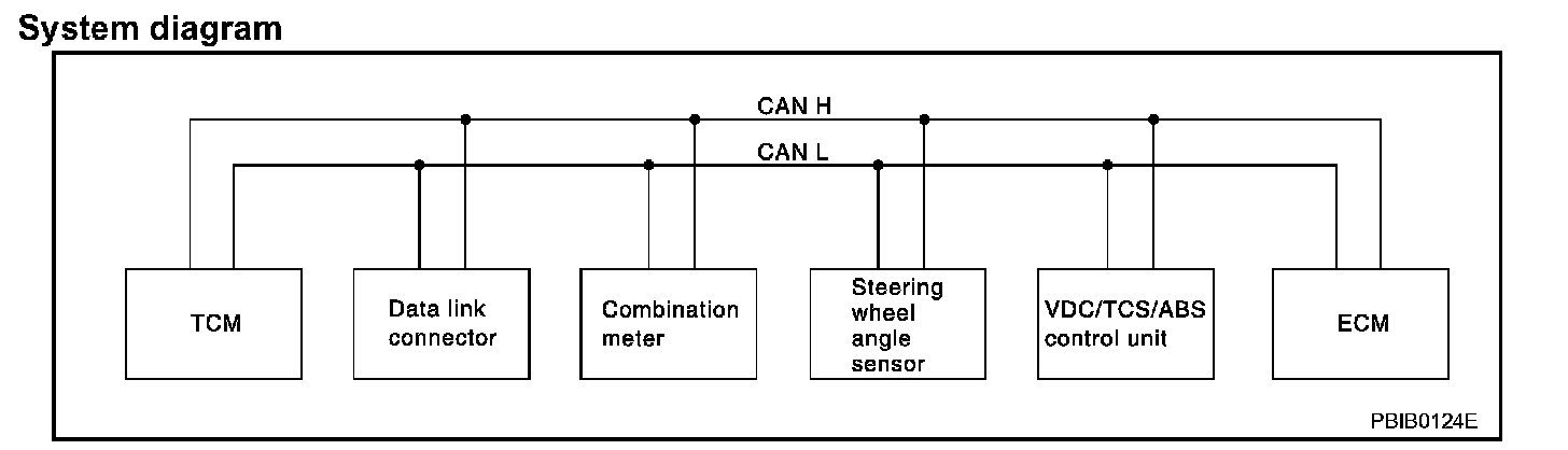 CAN (Controller Area Network) is a serial communication line for real time application. It is an on-vehicle multiplex communication line with high data communication speed and excellent error detection ability. Many electronic control units are equipped onto a vehicle, and each control unit shares information and links with other control units during operation (not independent). In CAN communication, control units are connected with 2 communication lines (CAN H line, CAN L line) allowing a high rate of information transmission with less wiring. Each control unit transmits/receives data but selectively reads required data only.