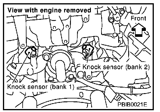 The knock sensor is attached to the cylinder block. It senses engine knocking using a piezoelectric element. A knocking vibration from the cylinder block is sensed as vibrational pressure. This pressure is converted into a voltage signal and sent to the ECM.