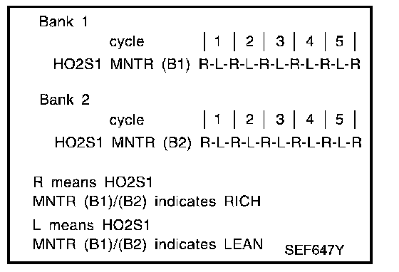 - "HO(2)S(1) MNTR (B1)/(B2)" in "DATA MONITOR" mode changes from "RICH" to "LEAN" to "RICH" 5 times in 10 seconds.
