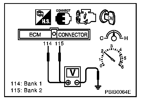 2. Set voltmeter probes between ECM terminal 114 [HO(2)S(1) (B1) signal] or 115 [HO(2)S(1) (B2) signal] and engine ground.