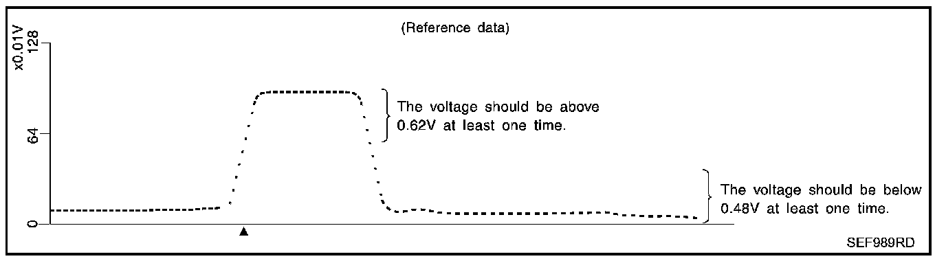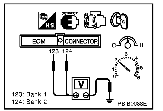3. Set voltmeter probes between ECM terminal 123 [HO(2)S(2) (B1) signal] or 124 [HO(2)S(2) (B2) signal] and engine ground.