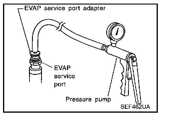 Positive pressure is delivered to the EVAP system through the EVAP service port. If fuel vapor leakage in the EVAP system occurs, use a leak detector to locate the leak.