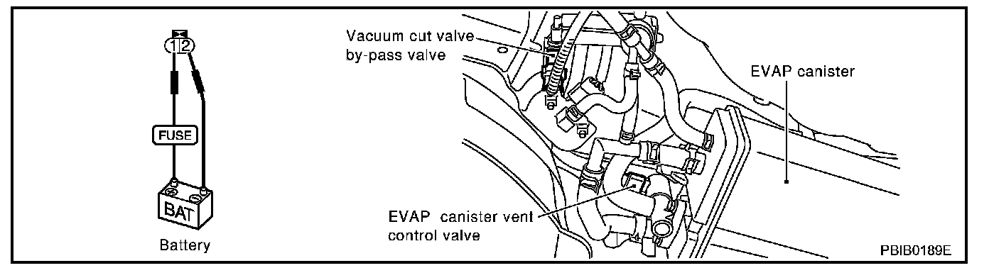 3. Apply battery voltage to between the terminals of both EVAP canister vent control valve and vacuum cut valve bypass valve to make a closed EVAP system.
