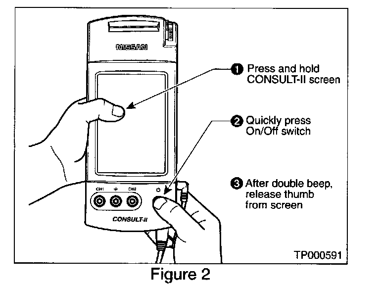 A. While pressing on the CONSULT-II screen with your thumb, quickly depress and release the ON/OFF switch (see Figure 2).