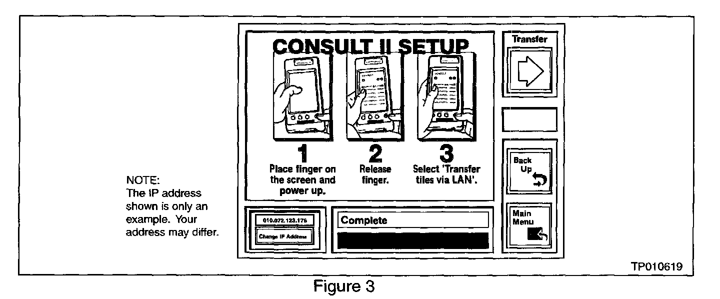DO NOT DISCONNECT THE ETHERNET CABLE UNTIL "COMPLETE" IS DISPLAYED AS SHOWN IN FIGURE 3. If the cable is disconnected before "Complete" is displayed you MUST restart the download procedure. Otherwise TCM damage can occur.