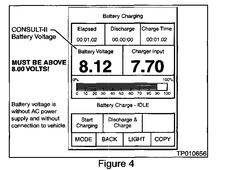 26. After about one minute has passed, check the CONSULT-II's battery voltage reading on the CONSULT-II screen (see Figure 4).