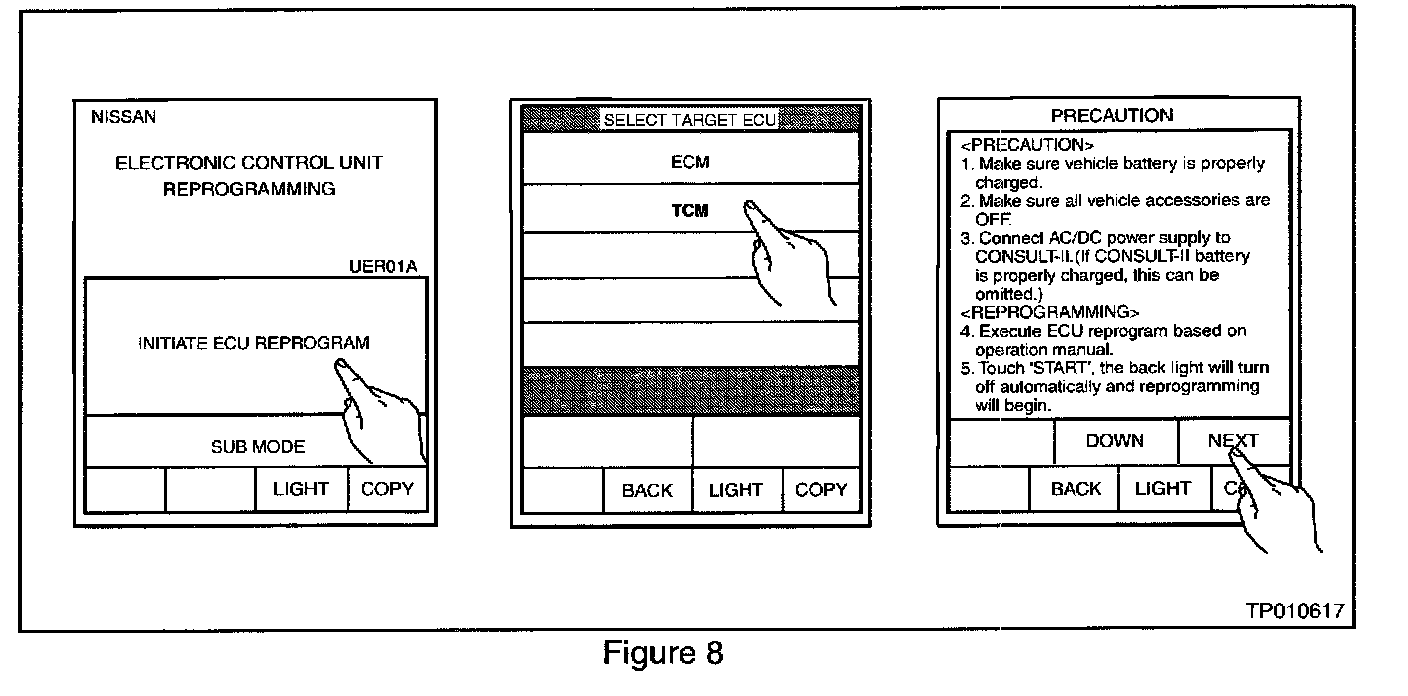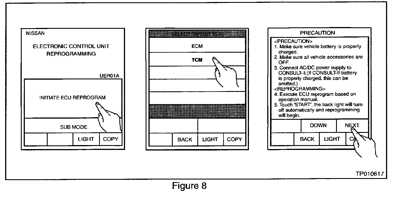 ^ Charge the CONSULT-II battery before proceeding with TCM Reprogramming