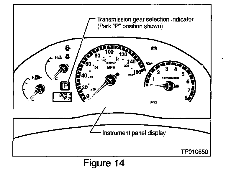 61. Depress the brake pedal and move the shift lever from "P" to "R" to "N" to "D" making sure the indicator next to the speedometer (see Figure 14) correctly displays each selected shift lever position.