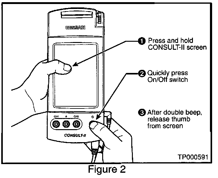 A. While pressing on the CONSULT-II screen with your thumb, quickly depress and release the ON/OFF switch (see Figure 2).