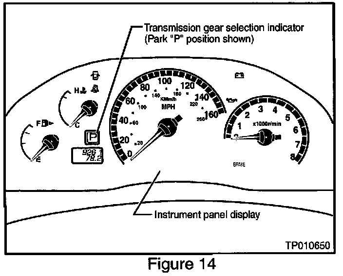 61. Depress the brake pedal and move the shift lever from "P" to "R" to "N" to "D", making sure the indicator next to the speedometer (see Figure 14) correctly displays each selected shift lever position.
