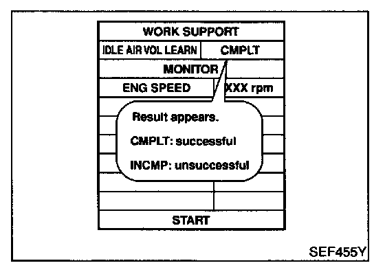 6. Make sure that "CMPLT" is displayed on CONSULT-II screen. If "INCMP" is displayed, "Idle Air Volume Learning" will not be carried out successfully. In this case, find the cause of the problem by referring to the "Diagnostic Procedure" below.