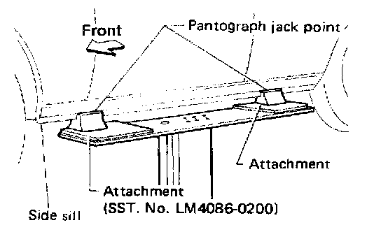 - The board-on lift attachment (LM4086-0200) set at front end of vehicle should be set on the front of the sill under the front door opening.