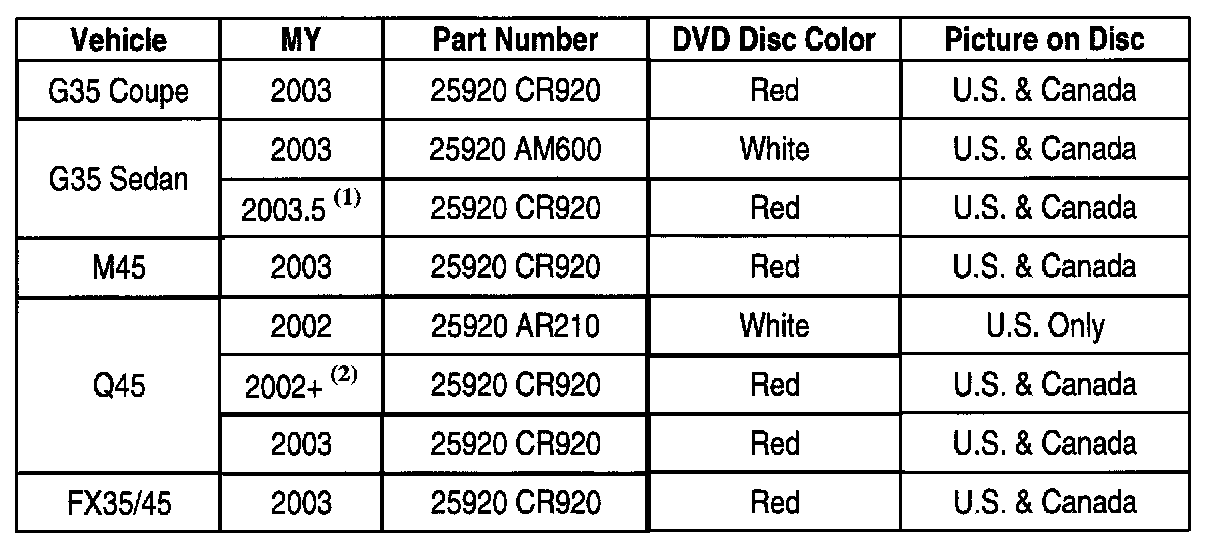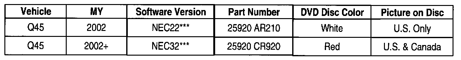 ^ 2002+ is the Red DVD Disc that must be used on all 2002 MY Q45 vehicles after they've had the Operating System upgrade.