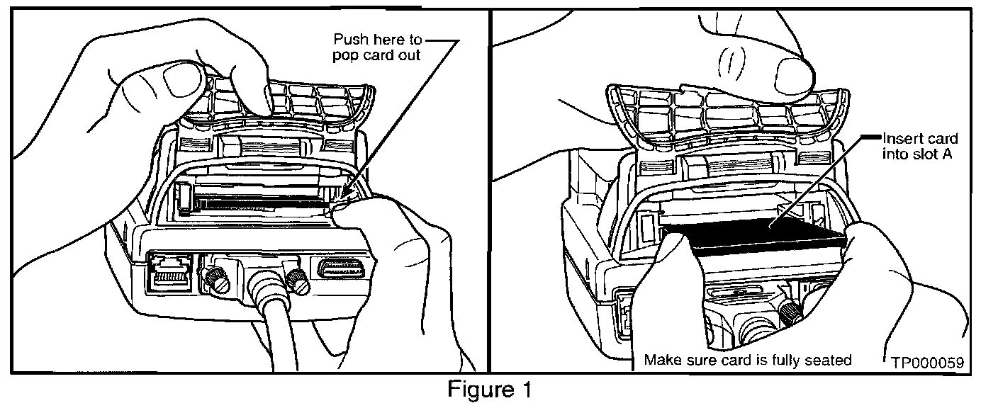 1. Remove the Diagnostics Card (blue) and install the ECM Reprogramming Software Card (orange) into slot A of CONSULT-II (see Figure 1).