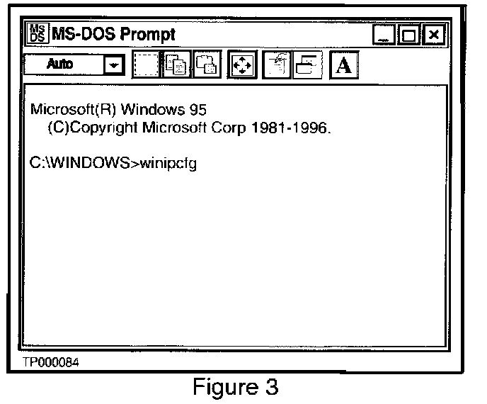 B. When the MS-DOS Prompt window appears, after C:\WINDOWS> type: winipcfg (see Figure 3).