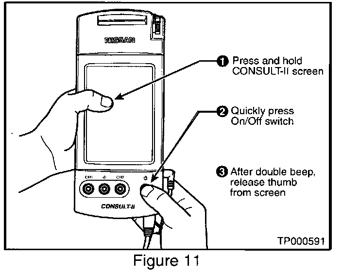 A. While pressing on the CONSULT-II screen with your thumb, quickly depress and release the ON/OFF switch (see Figure 11).