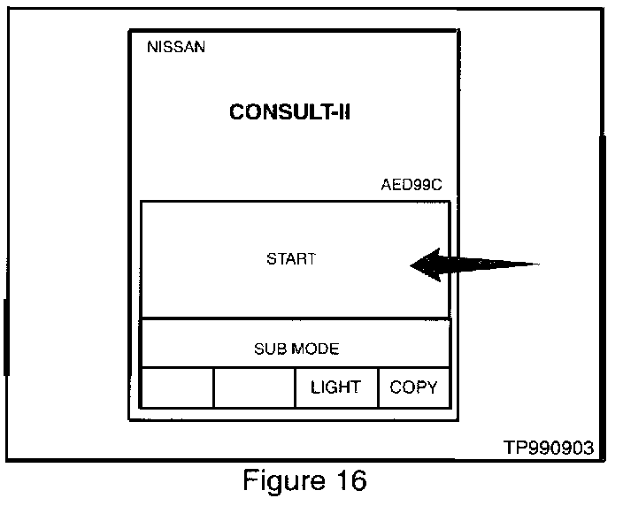 15. Turn the ignition switch "ON" (do not start the engine). Press CONSULT-II's ON button if it does not turn on automatically with the ignition switch (see Figure 16).