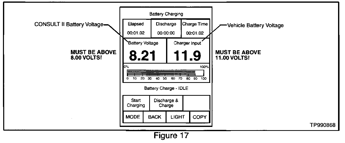 17. Refer to Figure 17. The vehicle battery voltage is "Charger Input". "Battery Voltage" is CONSULT-II's battery voltage.