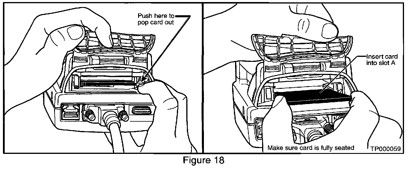 19. Remove the Diagnostics (blue) card from slot A of CONSULT-II and install the ECM Reprogramming card (orange) into slot A (see Figure 18).