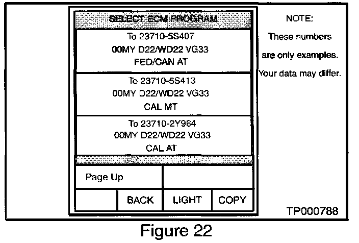 26. Select the correct ECM program (the number you wrote down in step 7D, in this procedure) to install from the choices on the CONSULT-II screen (see Figure 22).